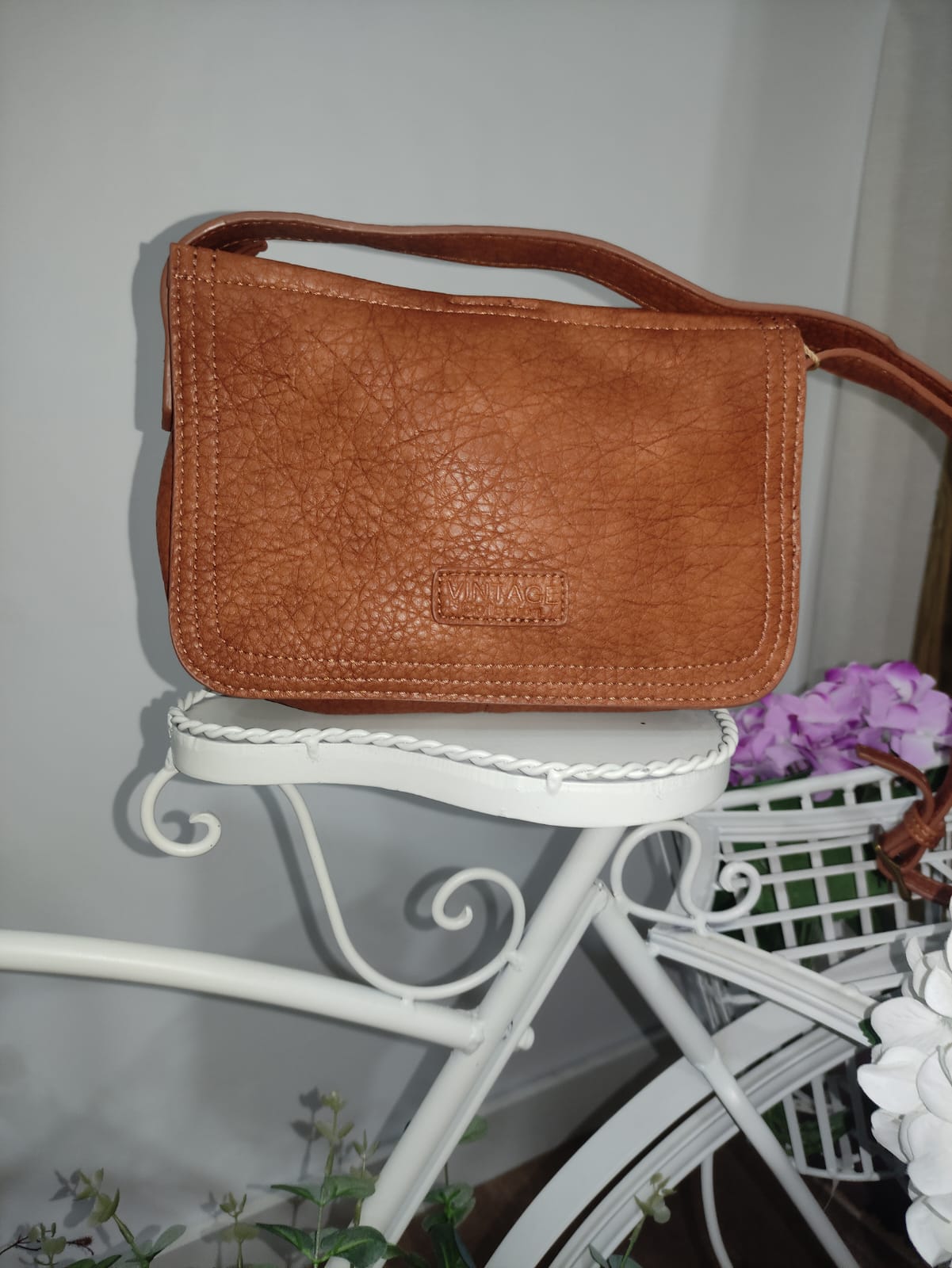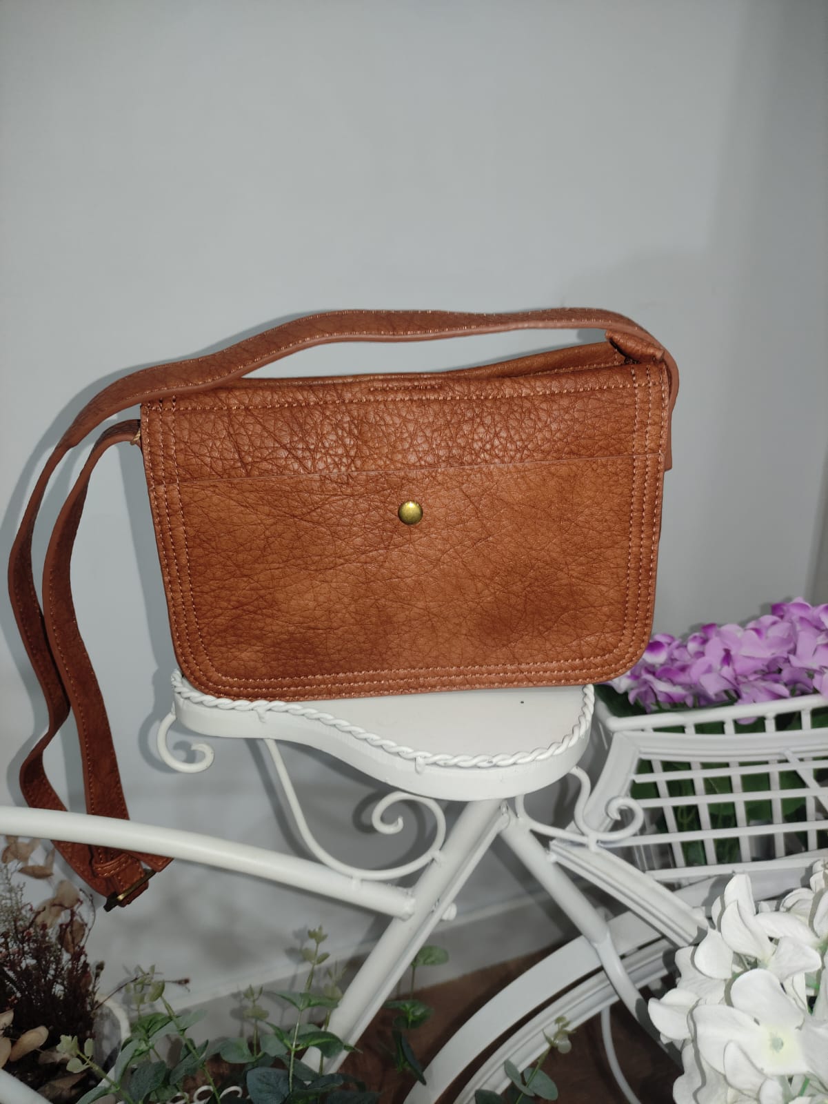 Bolso de tamaño mediano de color marrón tierra con tres apartados en el interior y atrás del bolso