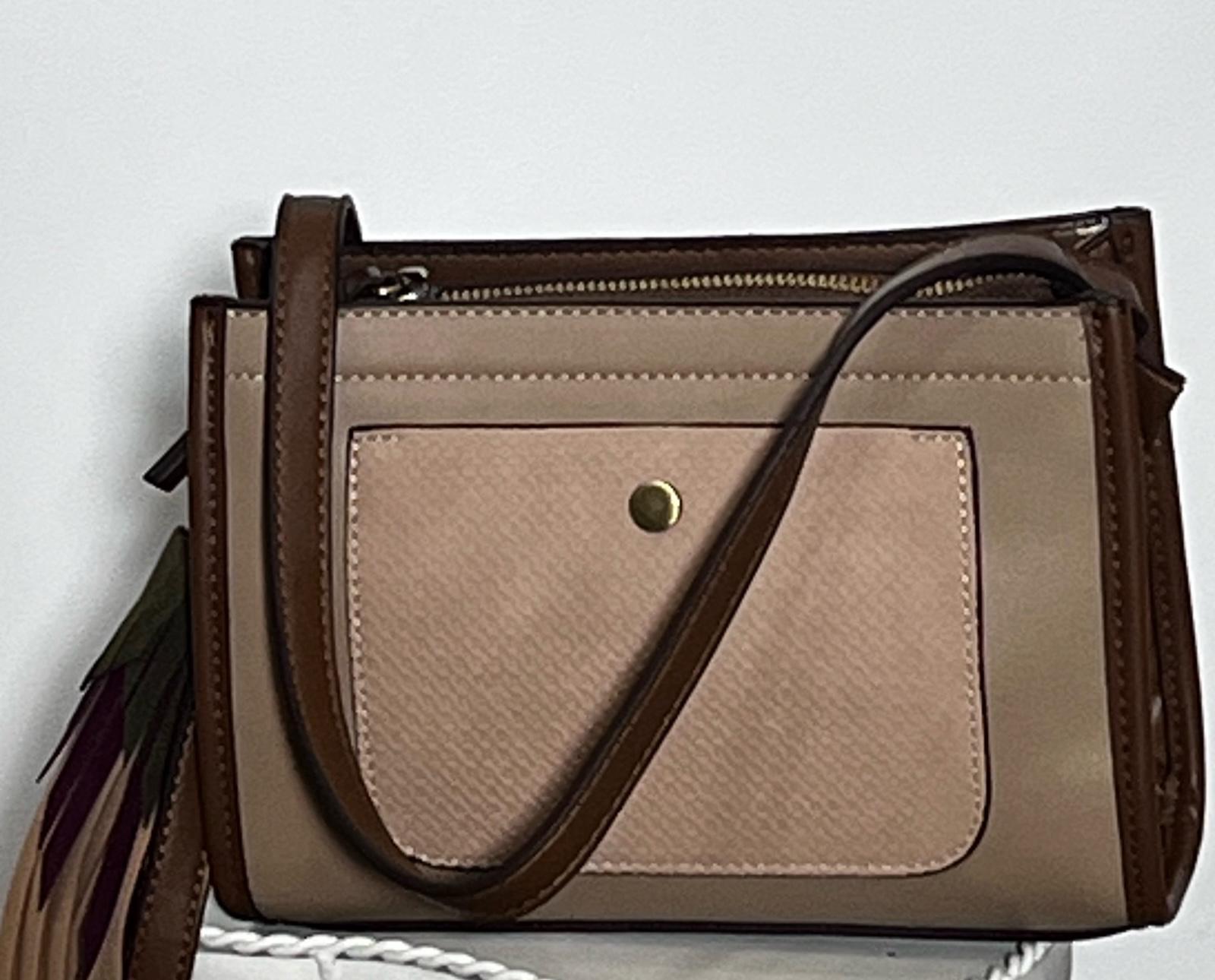 Bolso de tamaño mediano color marrón chocolate en el interior y beige en el exterior bolsillo en la parte de delante con cierre de botón adorno de flecos de material similar al cuero asa de bandolera ajustable