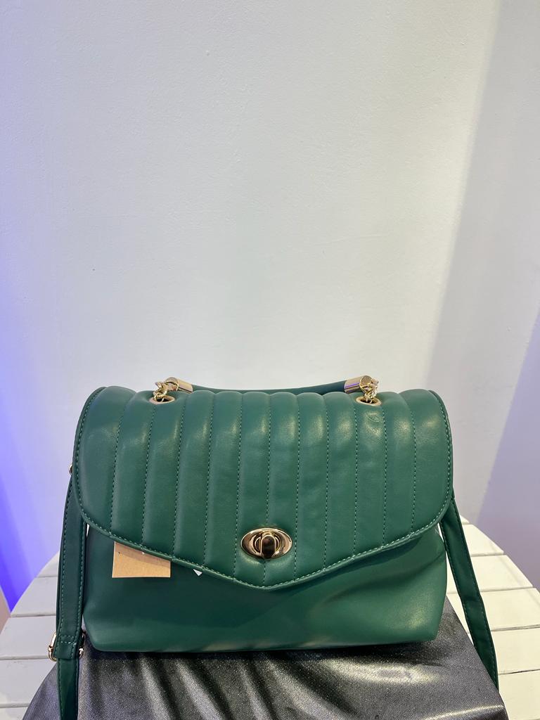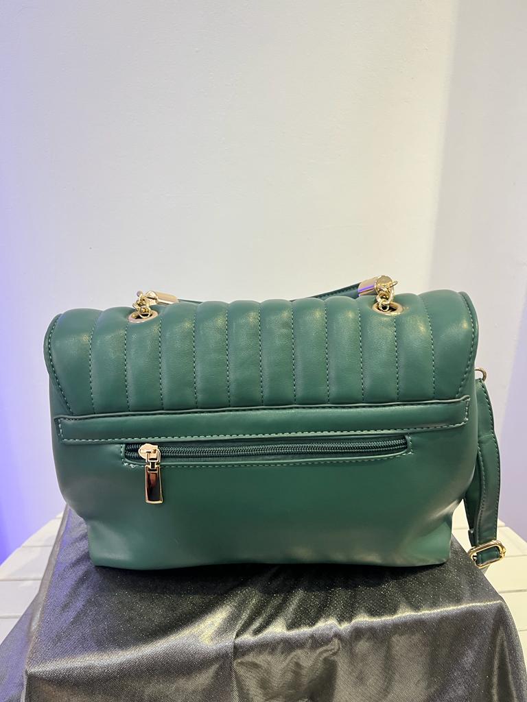 Bolso de tamaño mediano color verde oliva con asa corta de mano y asa larga ajustable