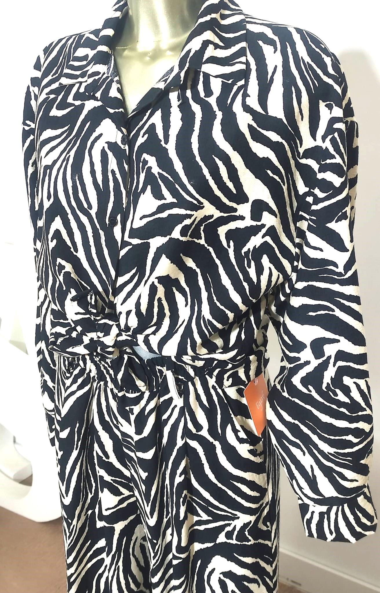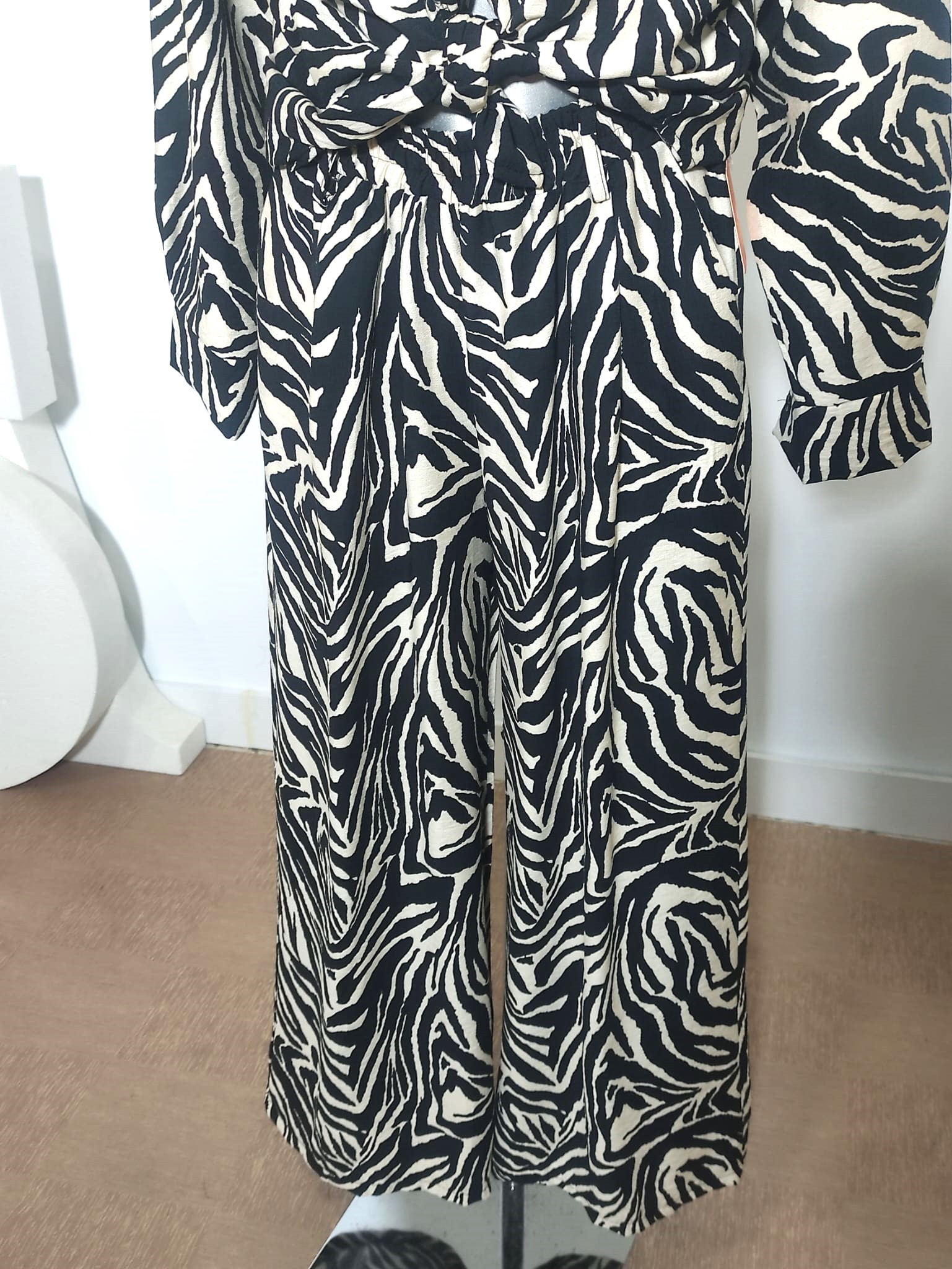 Camisa de estampado de cebra color negro y beige clarito cuello de solapa abotonada entera, la parte de atrás de un poco mas larga talla única tallaje desde la M,L,XL,XXL