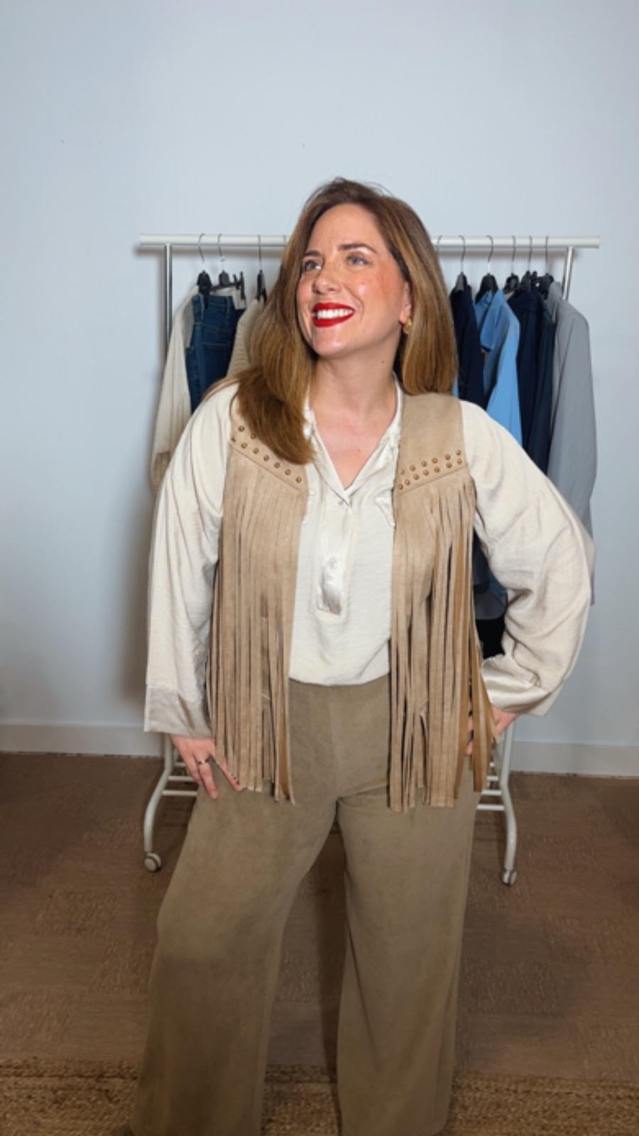 Chaleco de tejido antelina de color beige con flecos en la parte de delante y en la parte baja del chaleco lleva unas tachuelas doradas de adorno en la parte alta del chaleco talla única tallaje desde la S,M L
