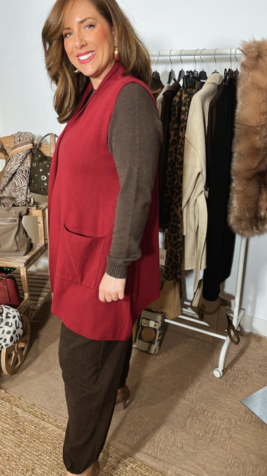 Chaleco de color granate largura por debajo de la cadera, tiene bolsillos el bajo del chaleco no es recto hace forma terminado en pico en los laterales talla única tallaje desde la M,L,XL,