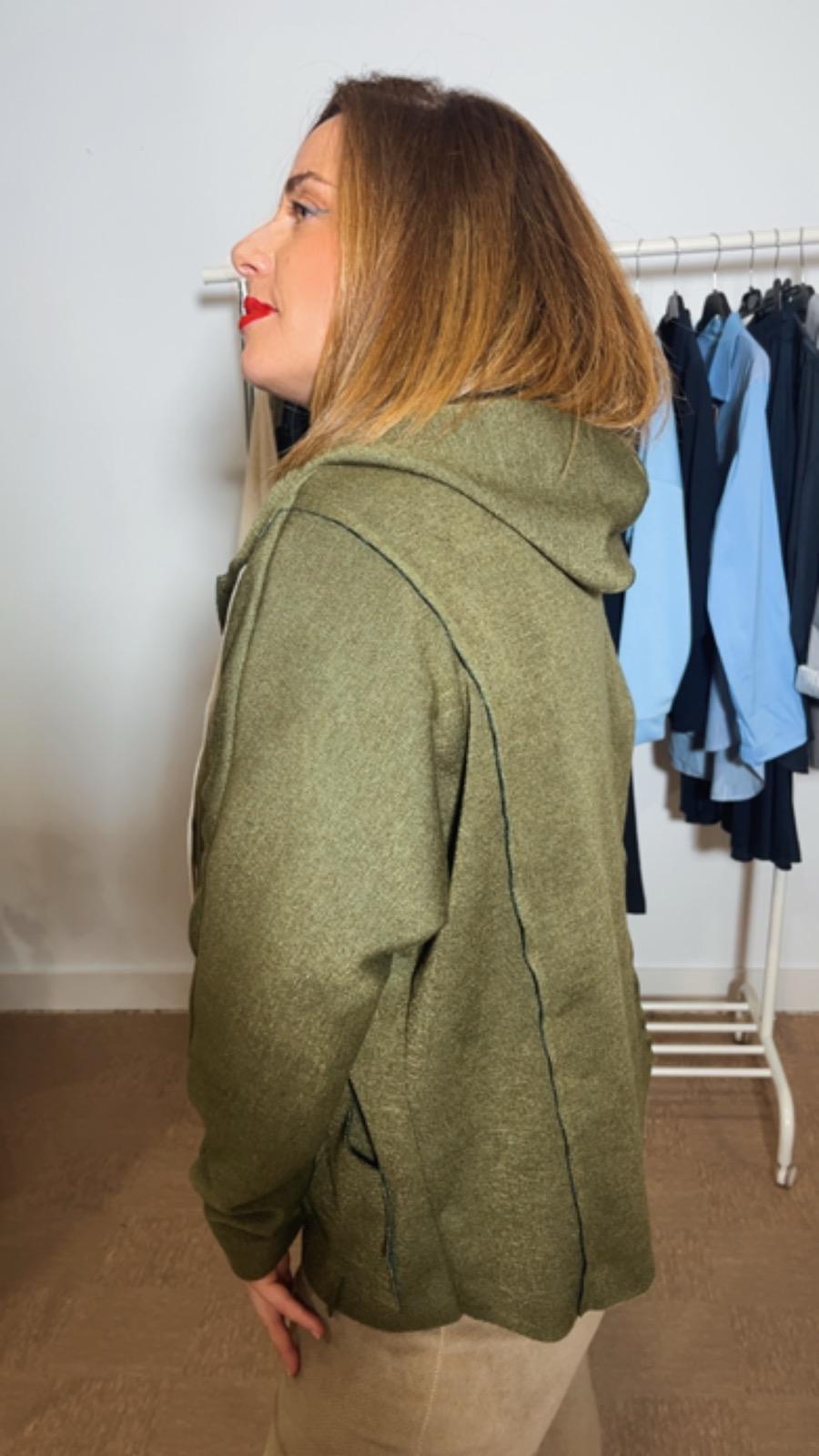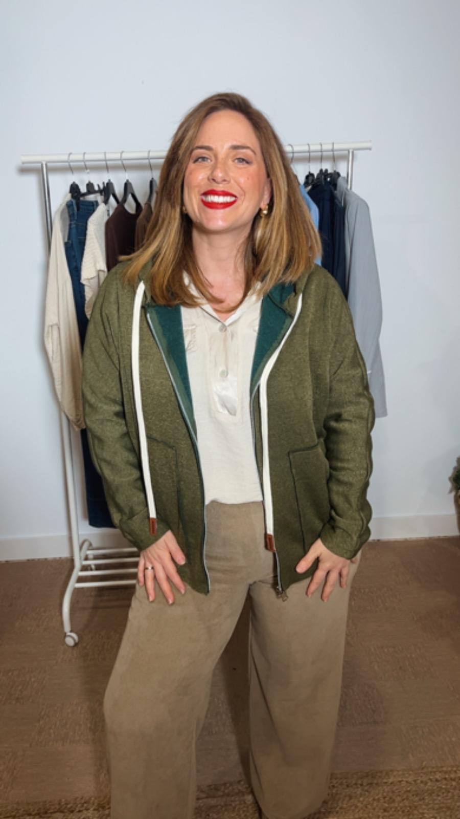 Chaqueta de tejido similar al punto color verde oliva con gorro el interior es de color verde oscuro, el cierre es de cremallera, lleva bolillos talla única tallaje desde la M,L,XL,XXL