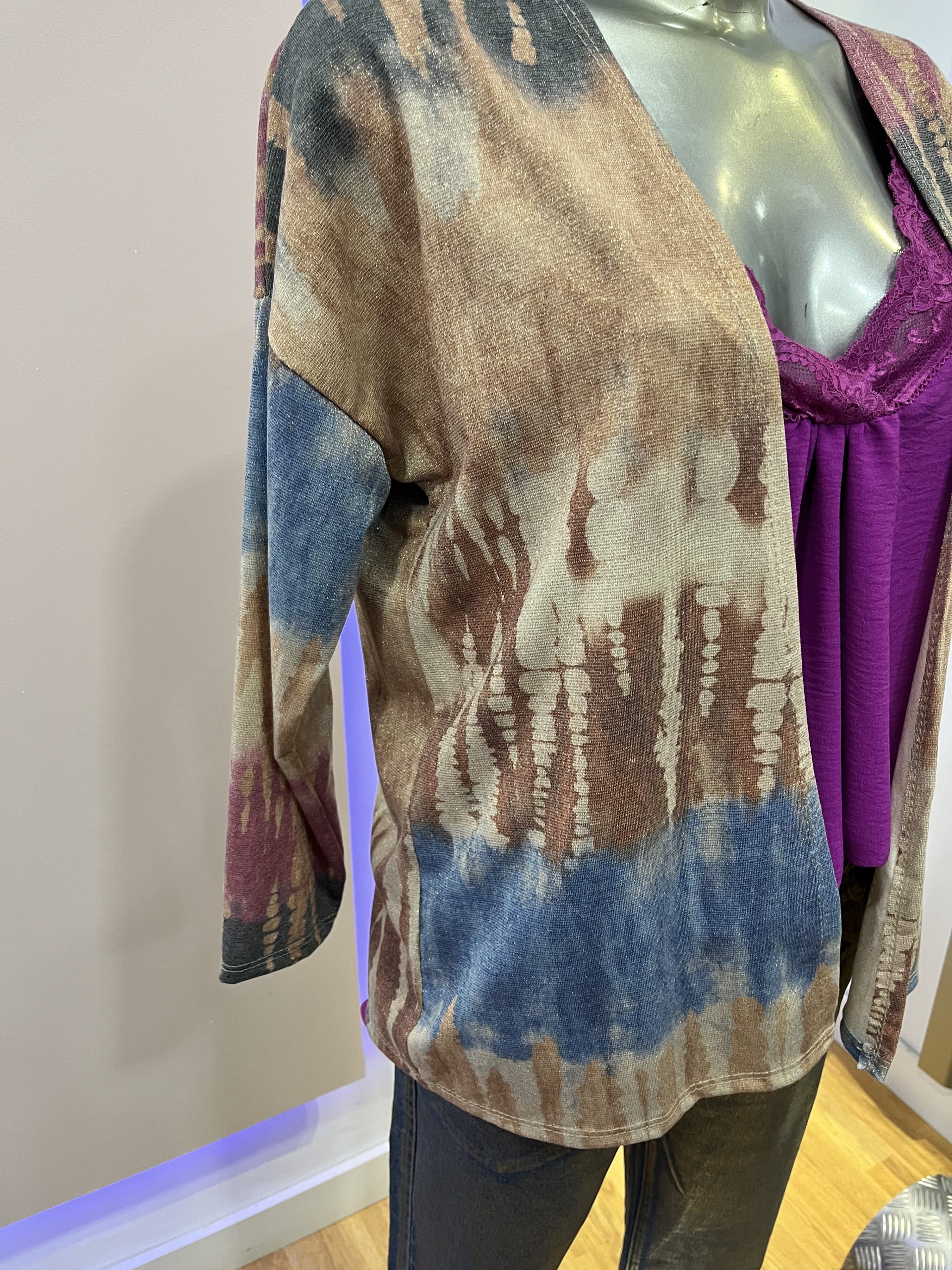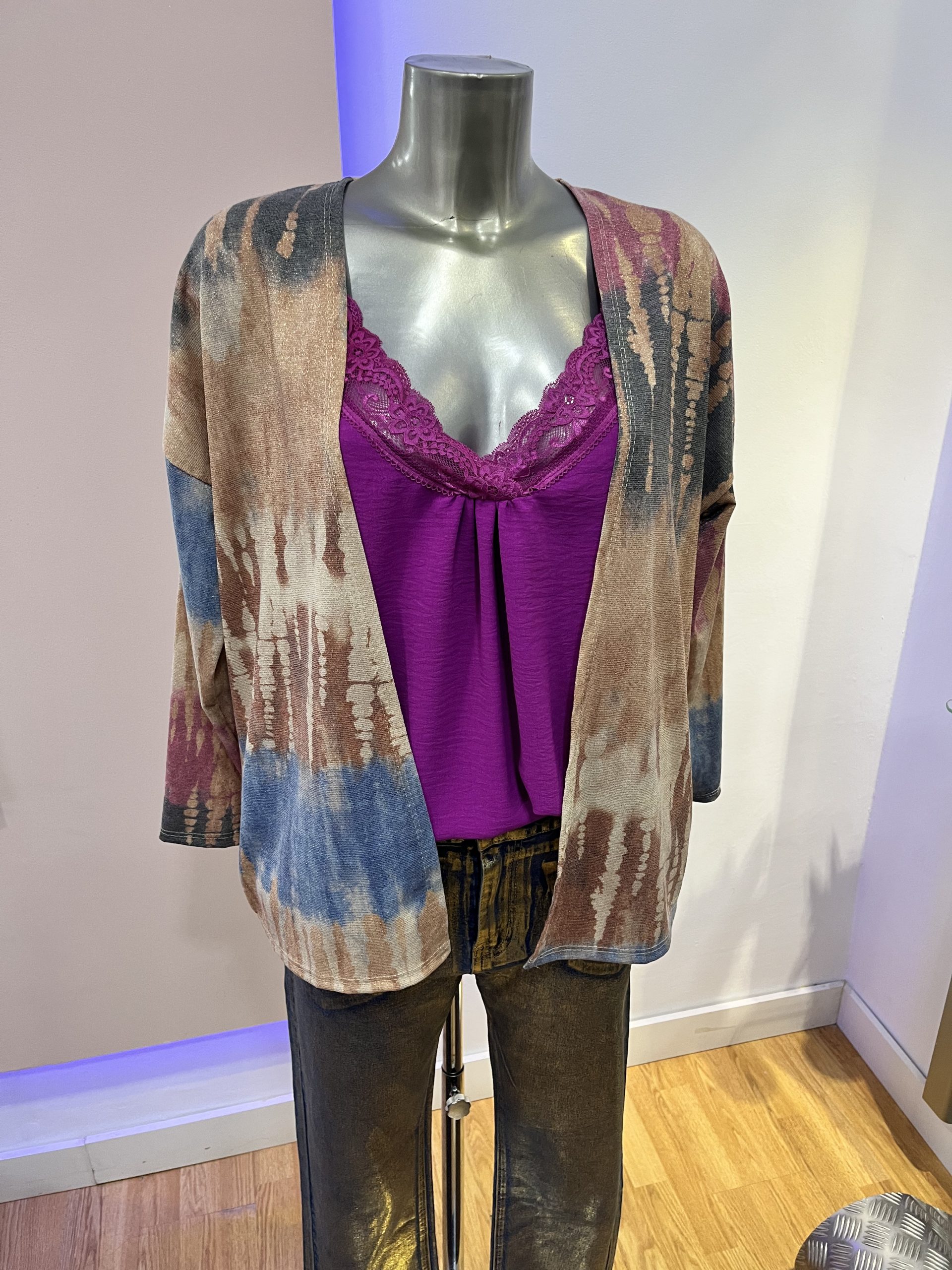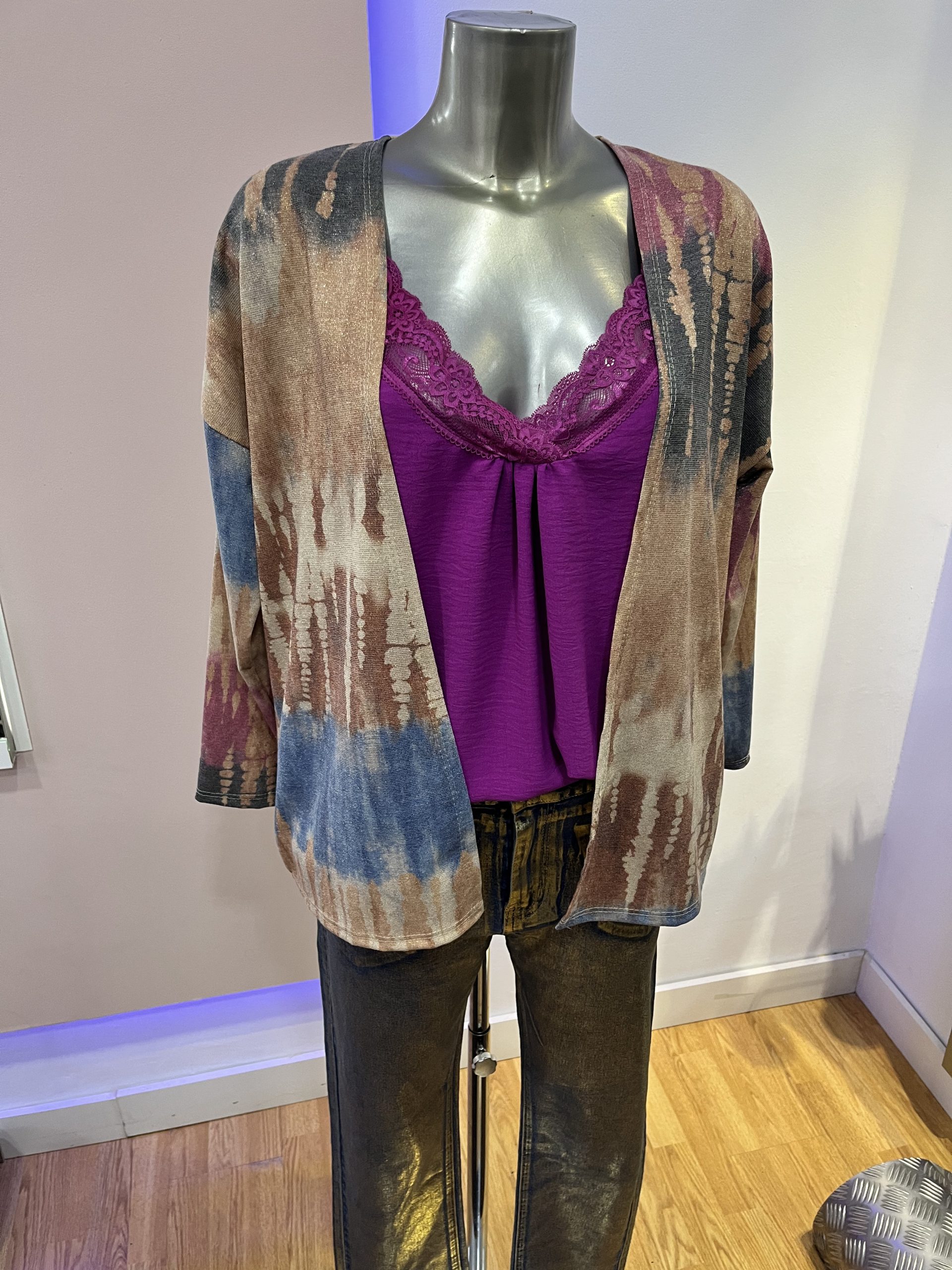 Chaqueta fina sin botones de estampado con colores variados fucsia beige dorado, azul talla única tallaje desde la M,L,XL
