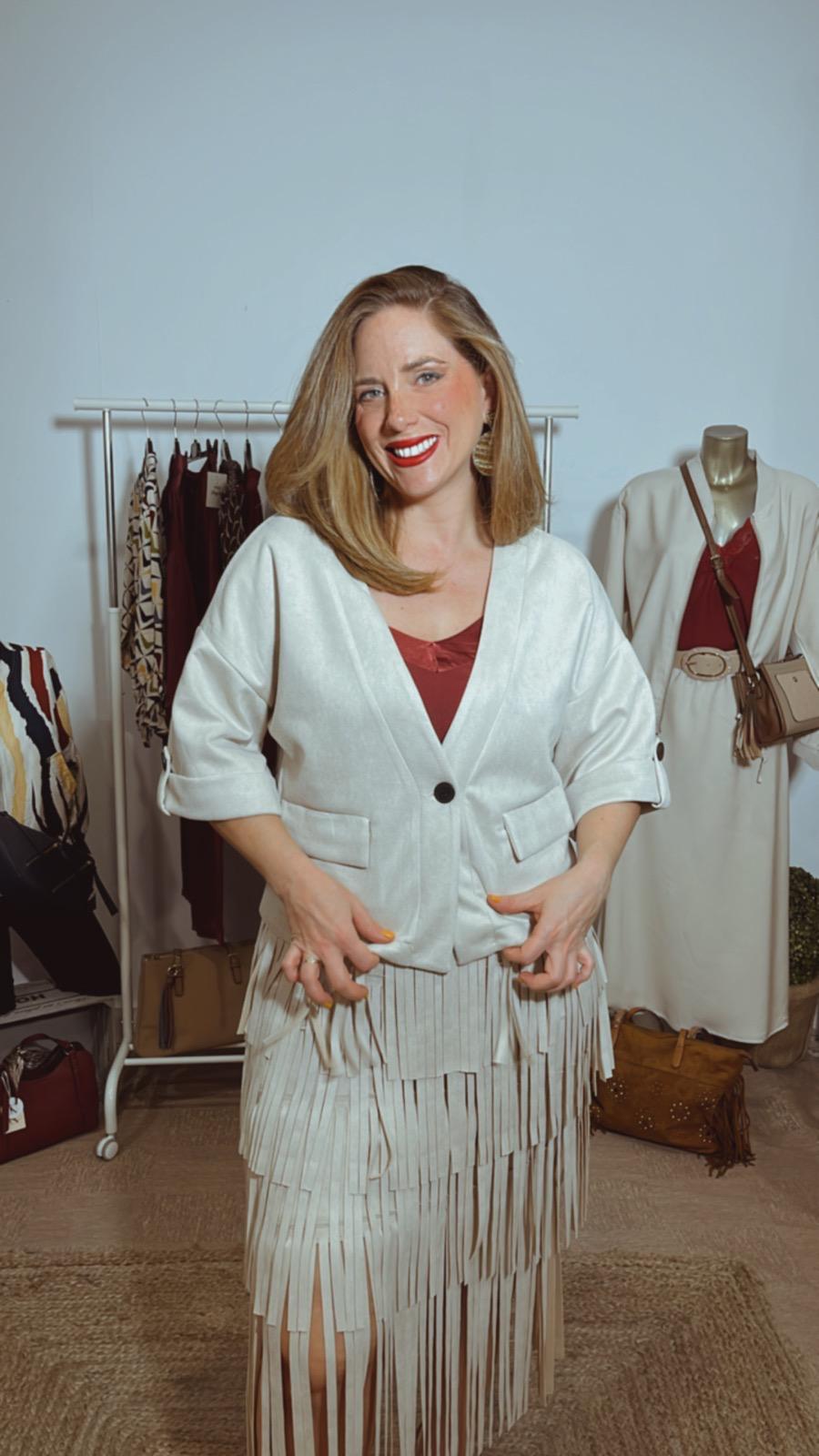 Chaqueta de tejido ante color beige clarito abrochada con un solo botón de color negro, lleva dos bolsillos, tiene manga hasta el codo con un trabilla grande con botón de adorno en ambas mangas talla única tallaje desde la M,L,XL,XXL