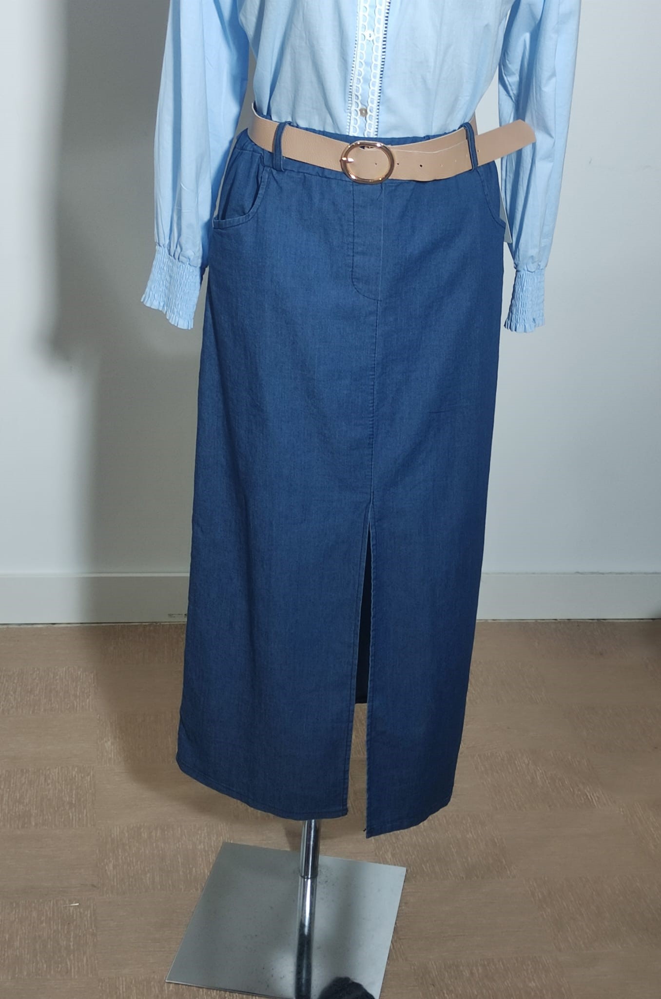 Falda larga de tejido vaquero fino tiene abertura en la parte de delante lleva bolsillos cintura de goma con cinturón de color beige talla única tallaje desde la 38 40 42 44