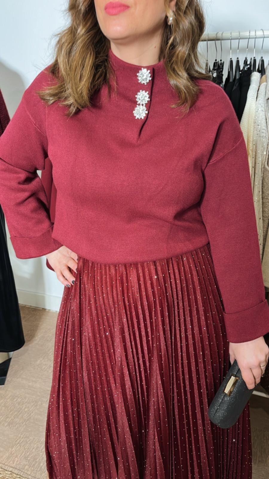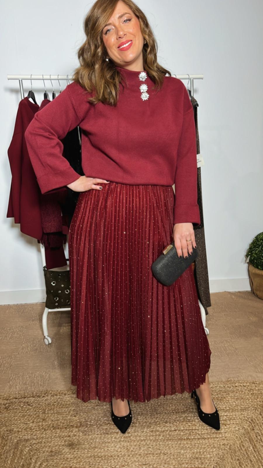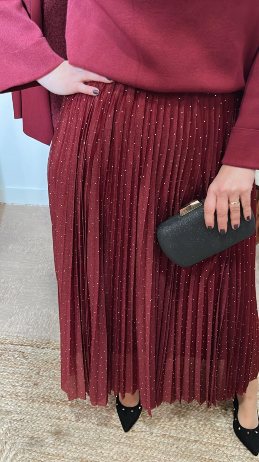 Falda de largura midi color granate , la falda es de dos capas la interior de satén y la exterior de tul con destellos en tono plateado cintura de goma talla única tallaje desde la M,L,XL