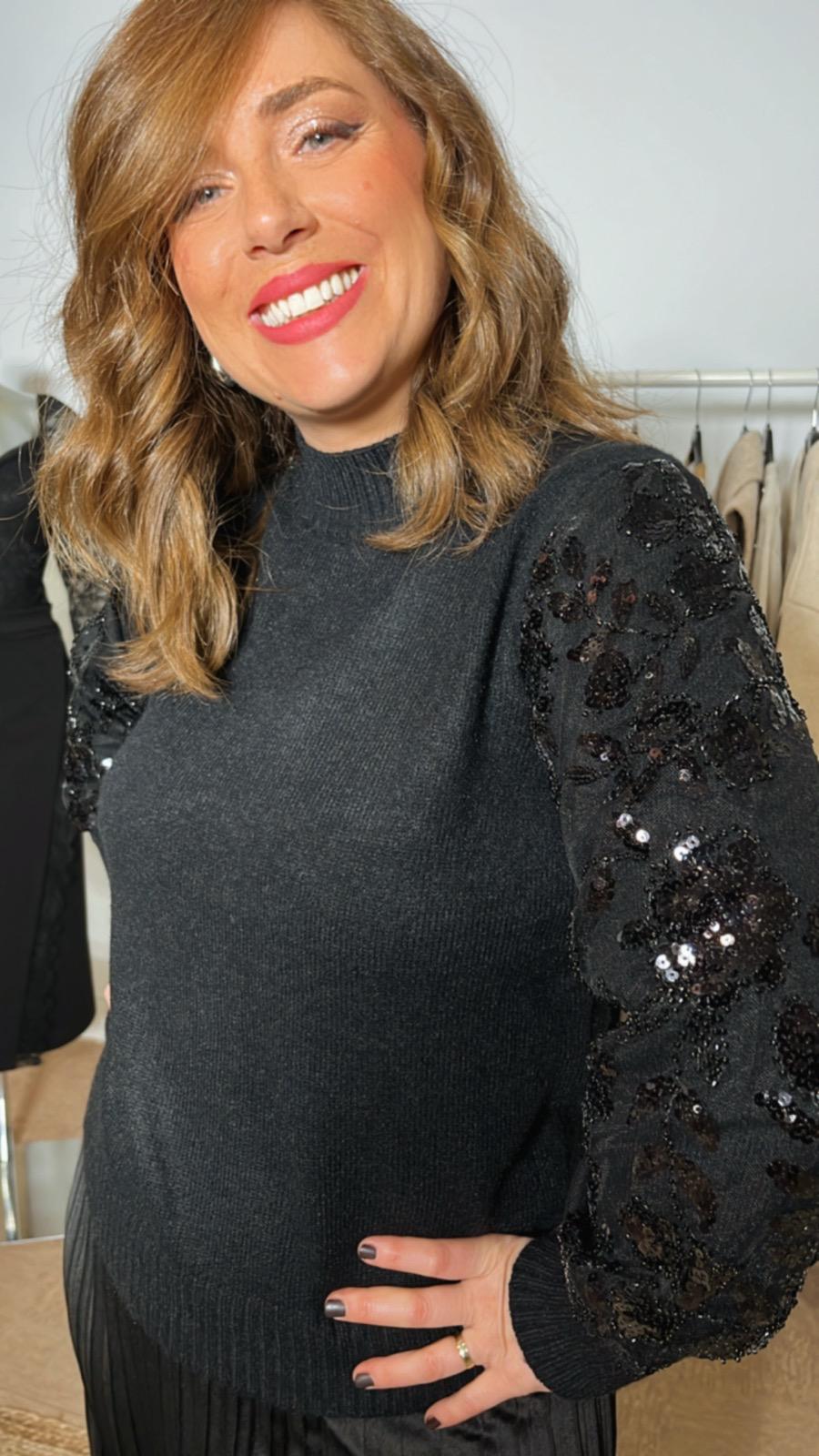 Jersey de tejido suave, color negro le adorna lentejuelas negras en las dos mangas, cuello redondo talla única tallaje desde S,M,L