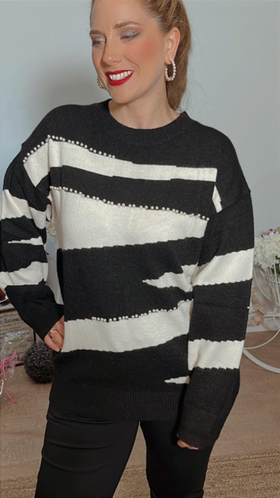 Jersey de punto suave color negro con líneas blancas cuello redondo lleva de adorno perlas incrustadas en el tejido talla única tallaje desde la 38 hasta la 40 42 44 46
