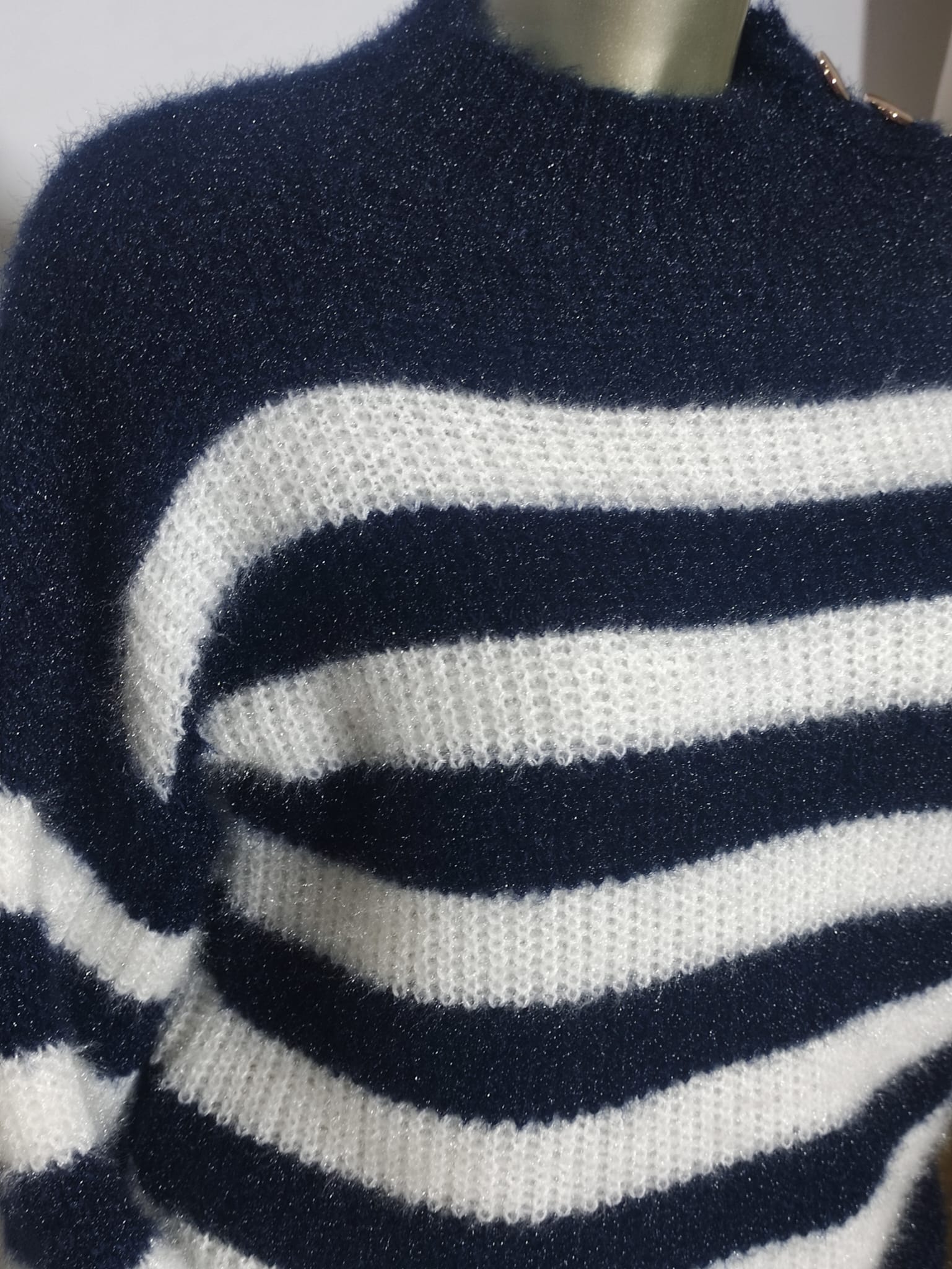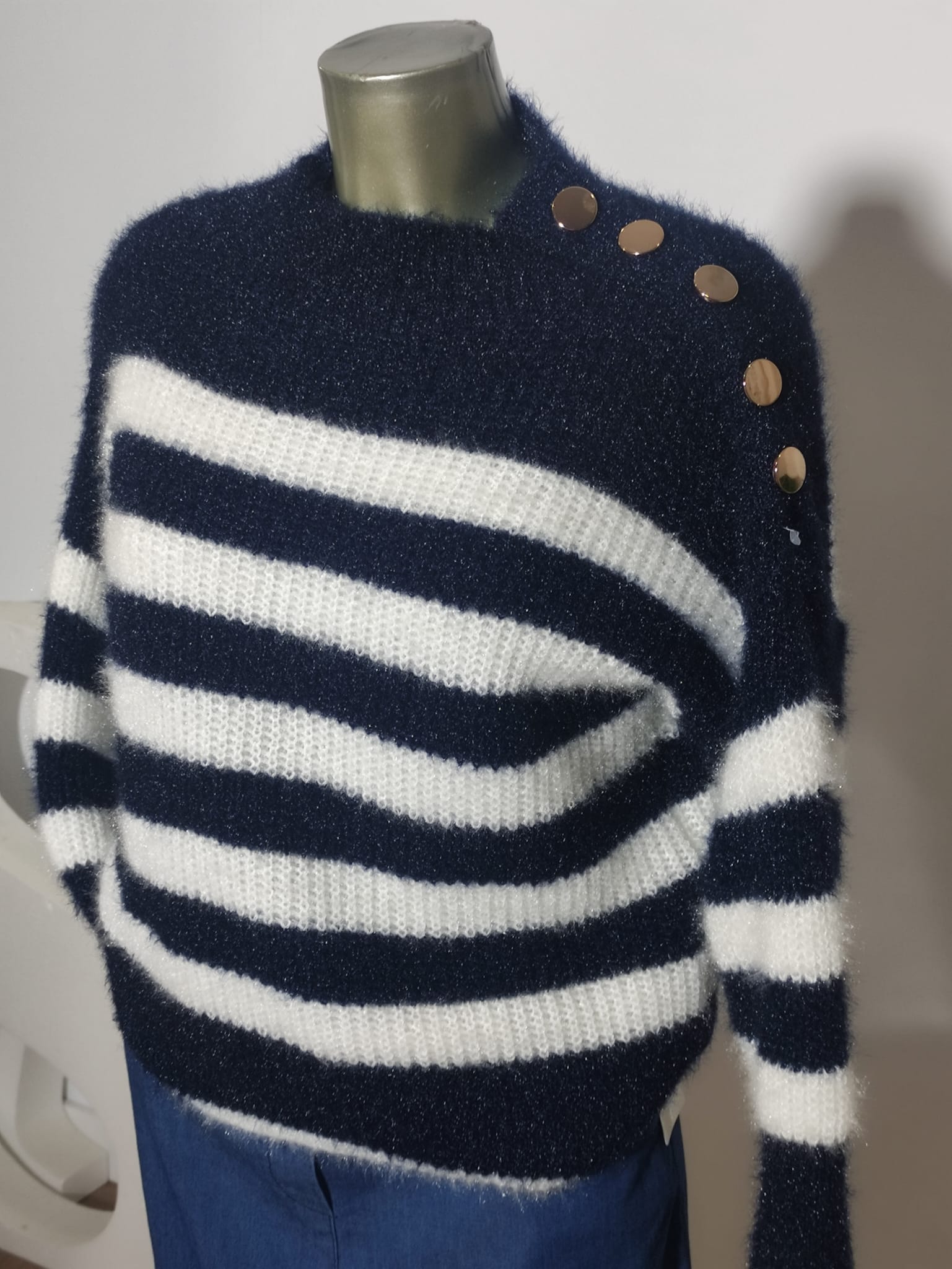 Jersey de tejido suave dibujo de lineas horizontales en color azul marino y blanco lleva adorno de botones dorados en el hombro izquierdo talla única tallaje desde la M,L,XL