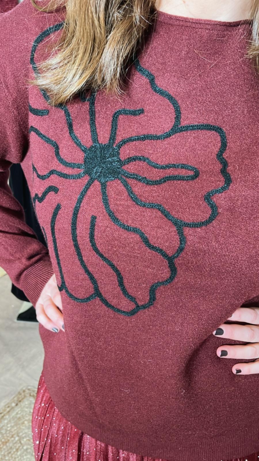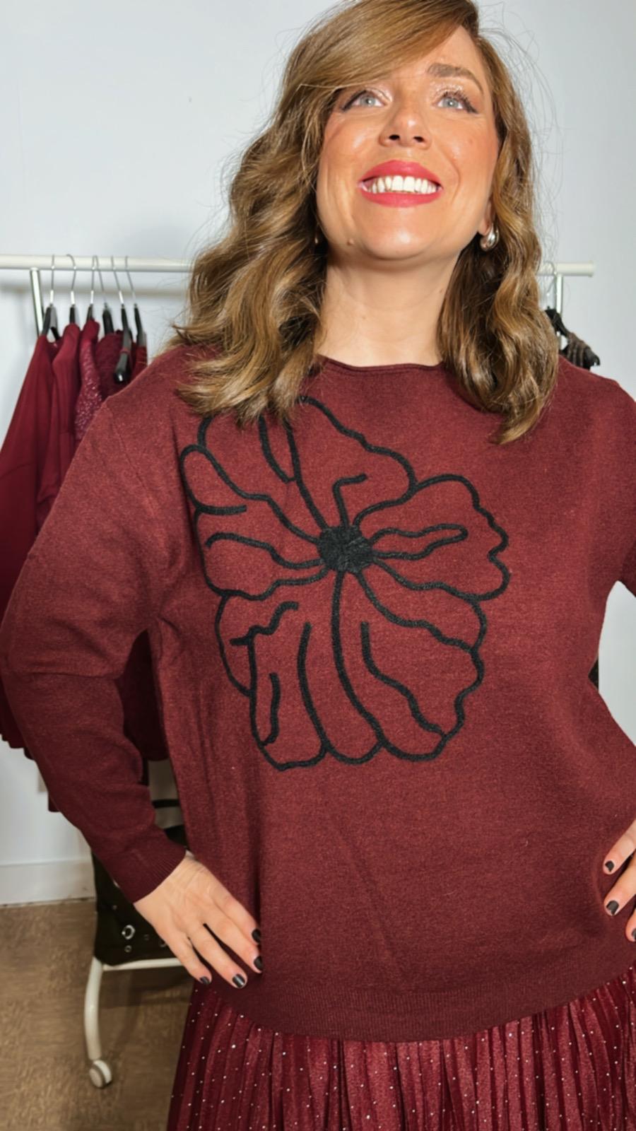 Jersey de color granate con adorno de relieve en flor de color negro talla única tallaje desde la S,M,L