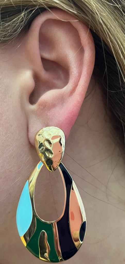 pendiente en forma de lágrima de color azul con textura metálica dorada.