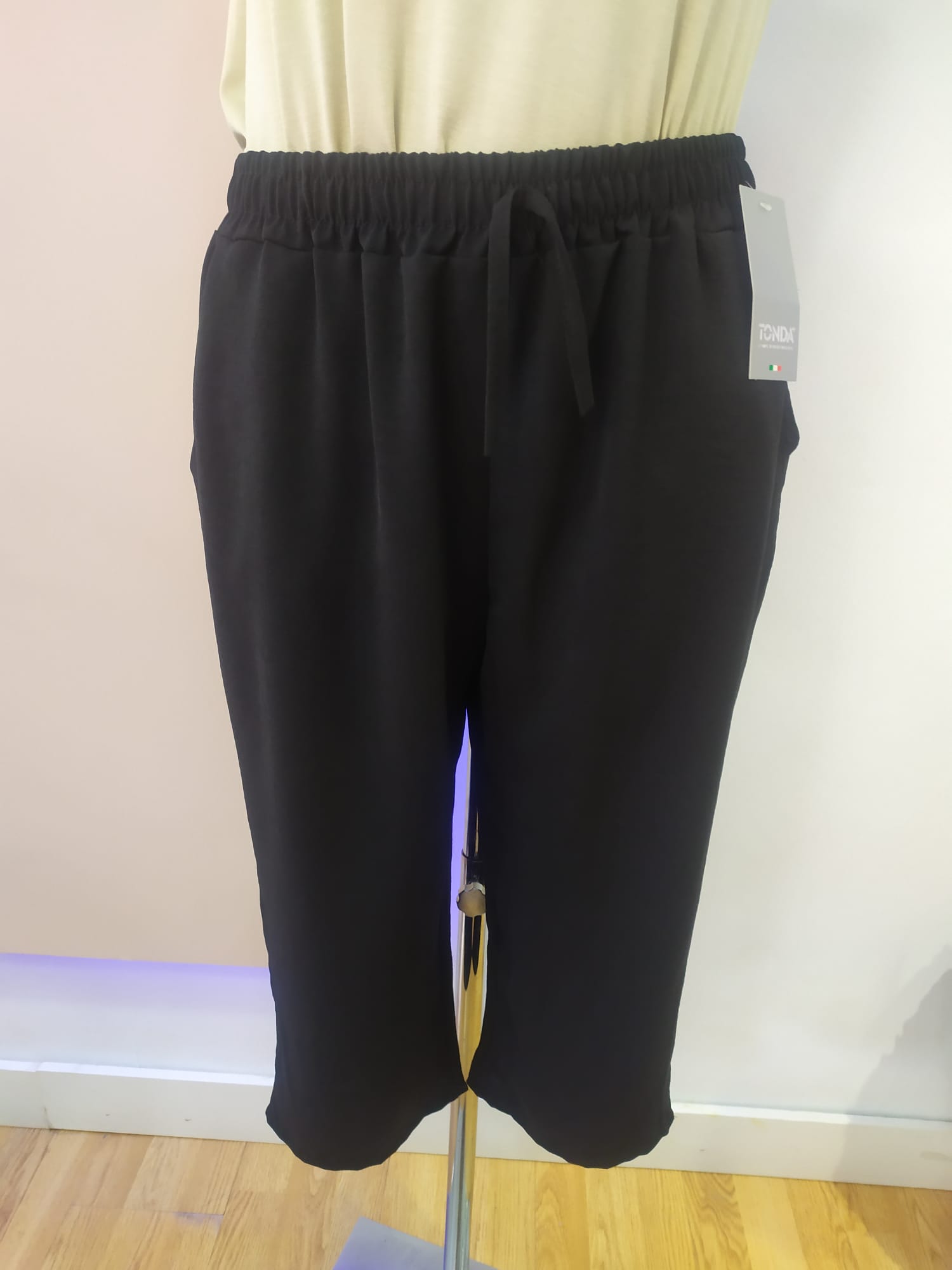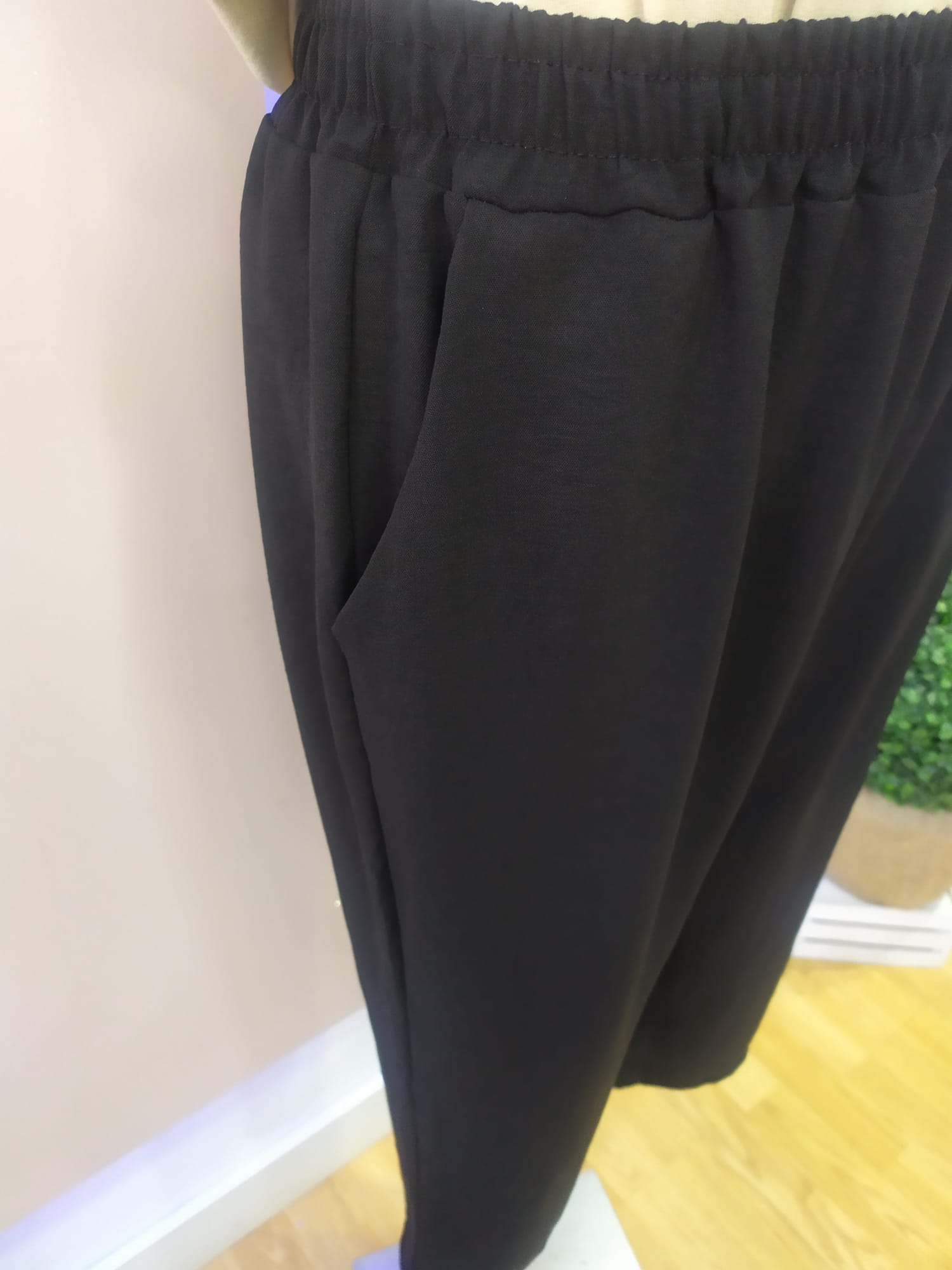 Pantalón color negro de corte recto, largo del pantalón de pirata con goma en la cintura adorno de las en la cintura del mismo tejido que el pantalón con bolsillos en los laterales talla única tallaje desde la 40 hasta la 48