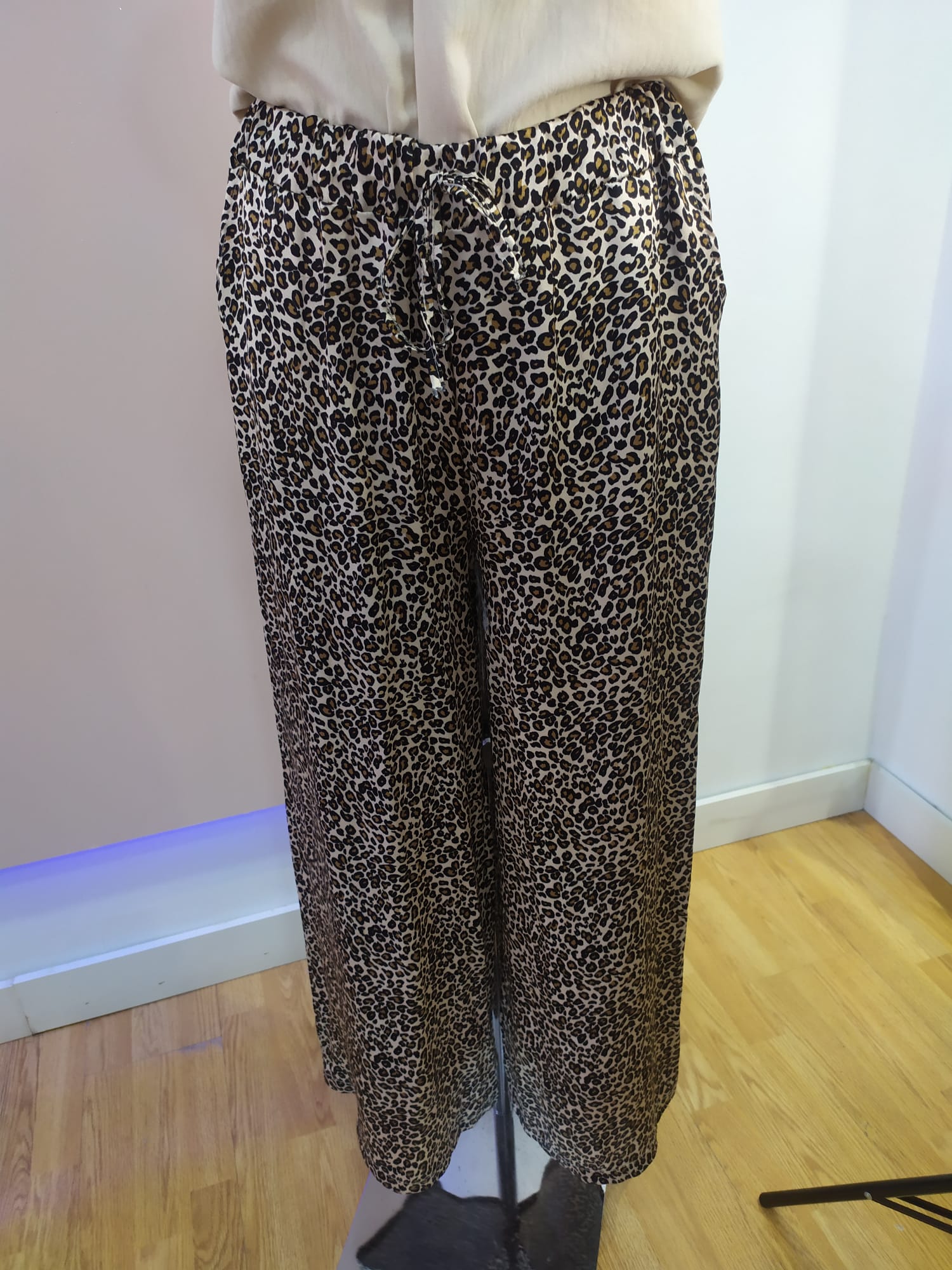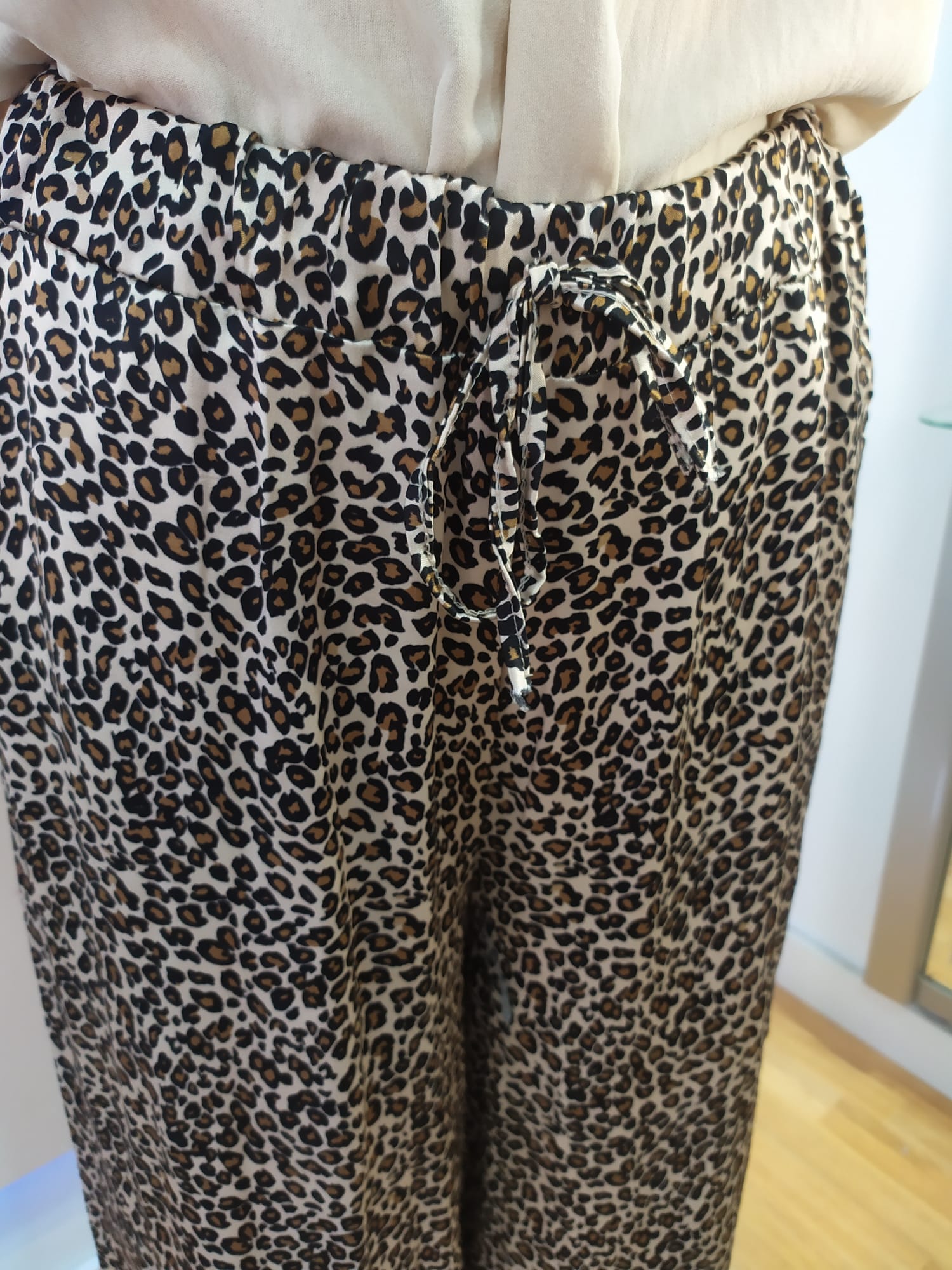 Pantalón de estampado animal print en tonos beige negros y marrones cintura con goma y lazo de adorno del mismo tono que el pantalón y bolsillos corte ancho talla única tallaje desde la 40 hasta la 48