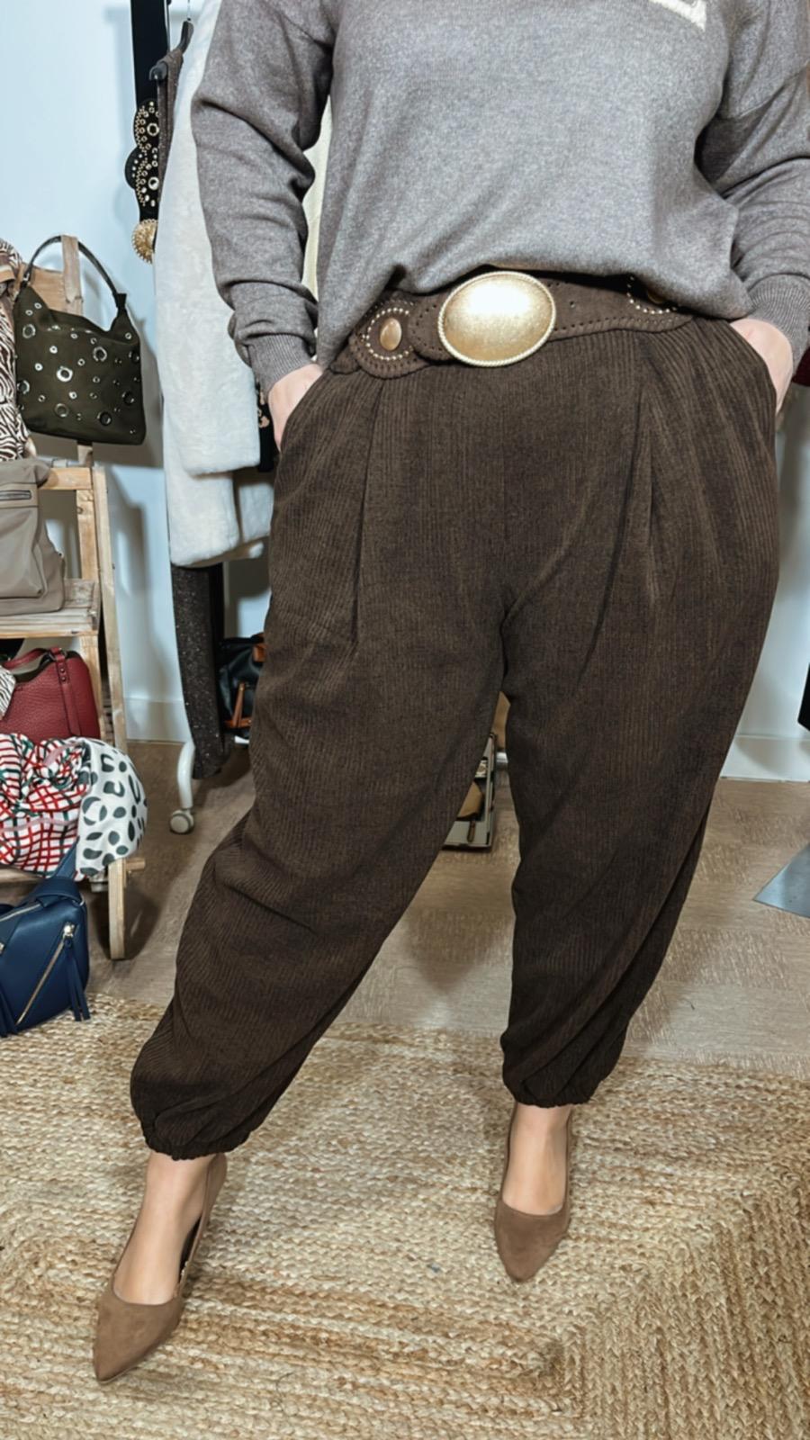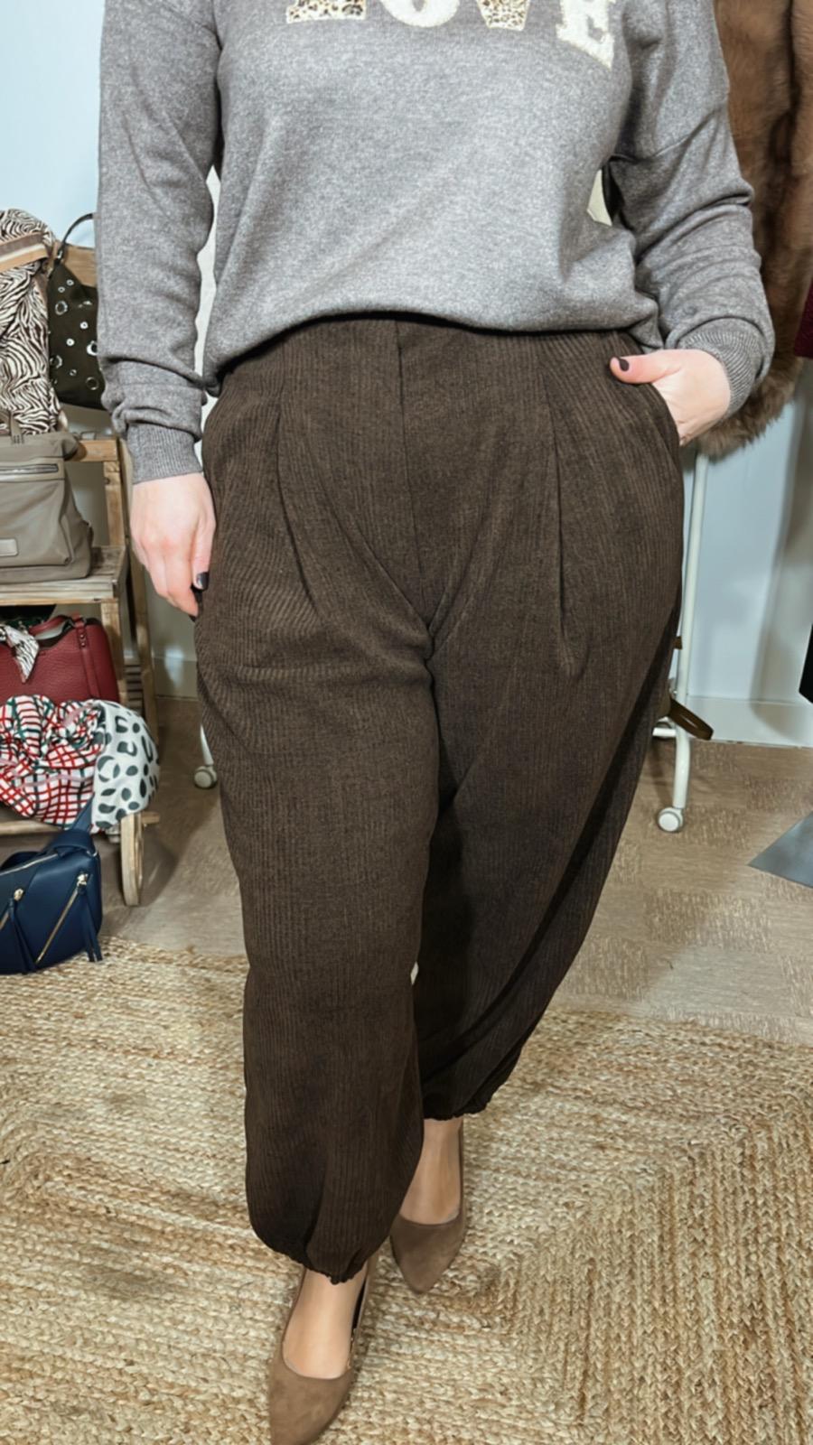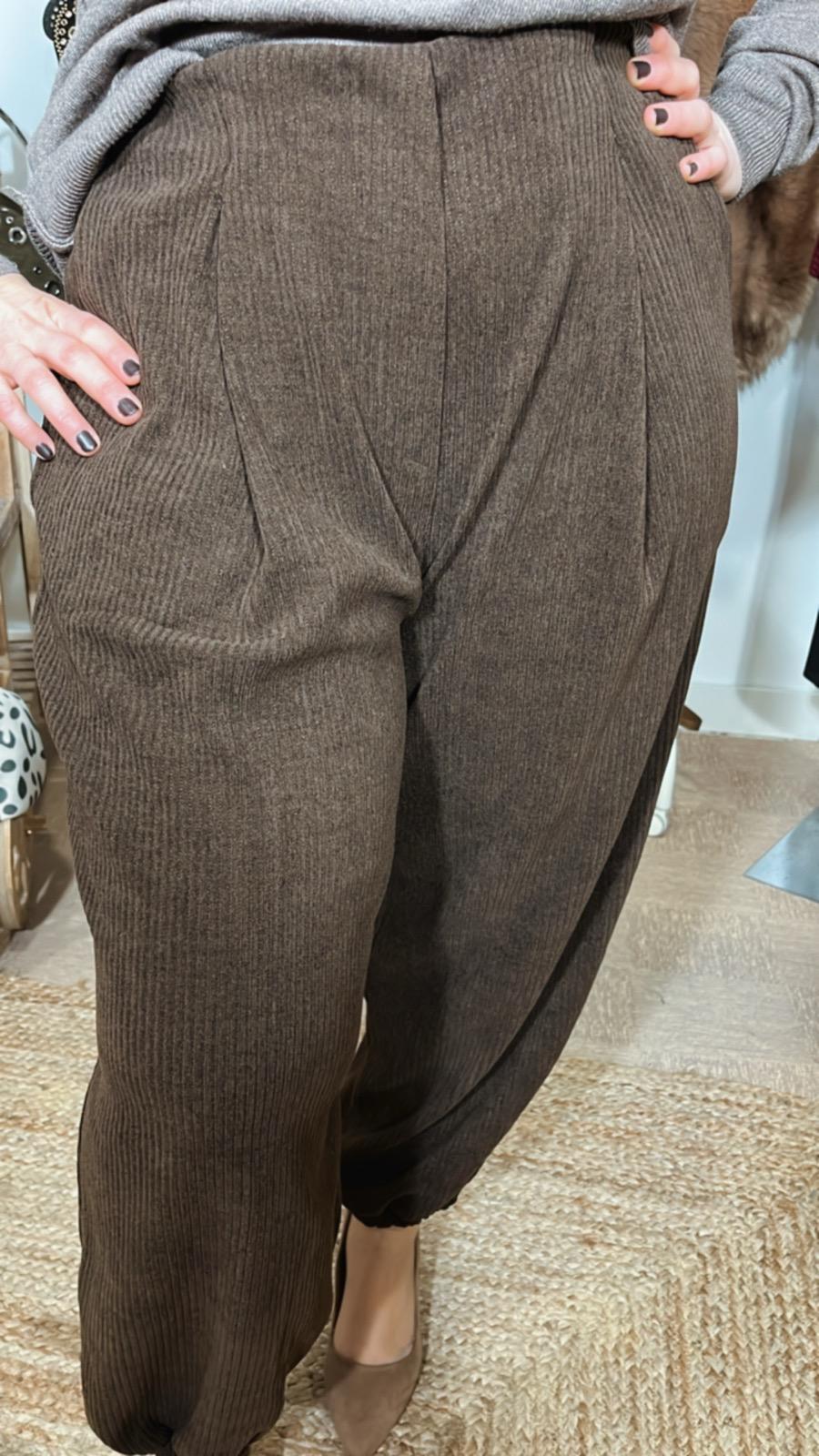 Pantalón con tejido imitando a la pana de color marrón chocolate cintura con goma, tiene dos pequeñas pinzas en la parte de delante además su terminación de la pierna viene ajustado por goma talla única tallaje desde la 40,42,44 46