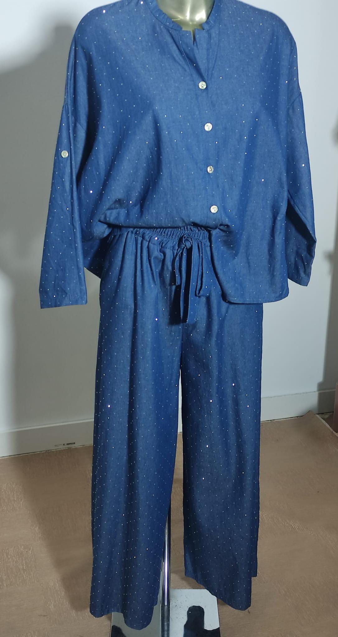 Pantalón de tejido fino color azul vaquero con pedreria en el tejido cintura de goma con lazo de adorno corte de pierna ancha talla única tallaje desde la 38 40 42