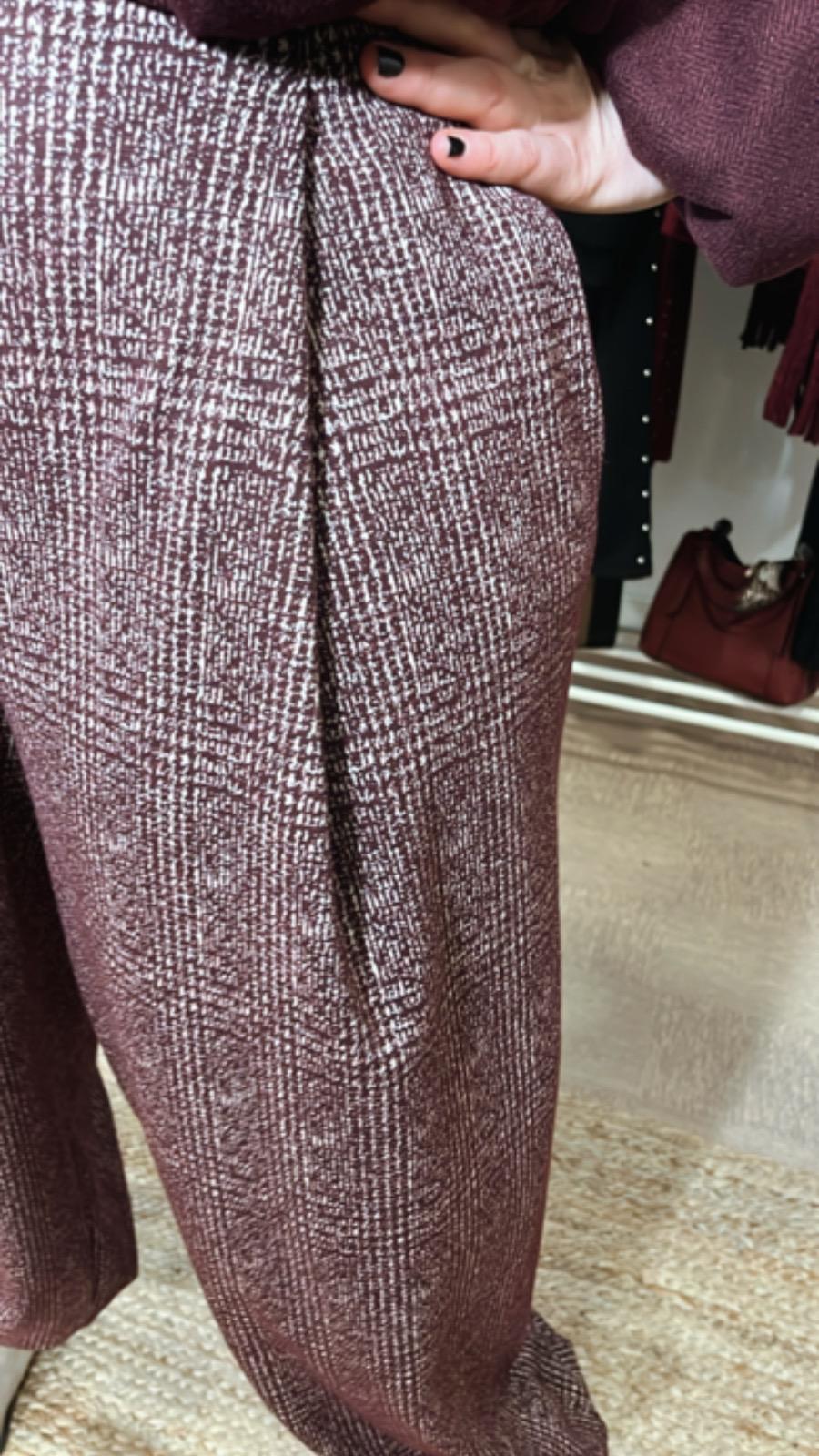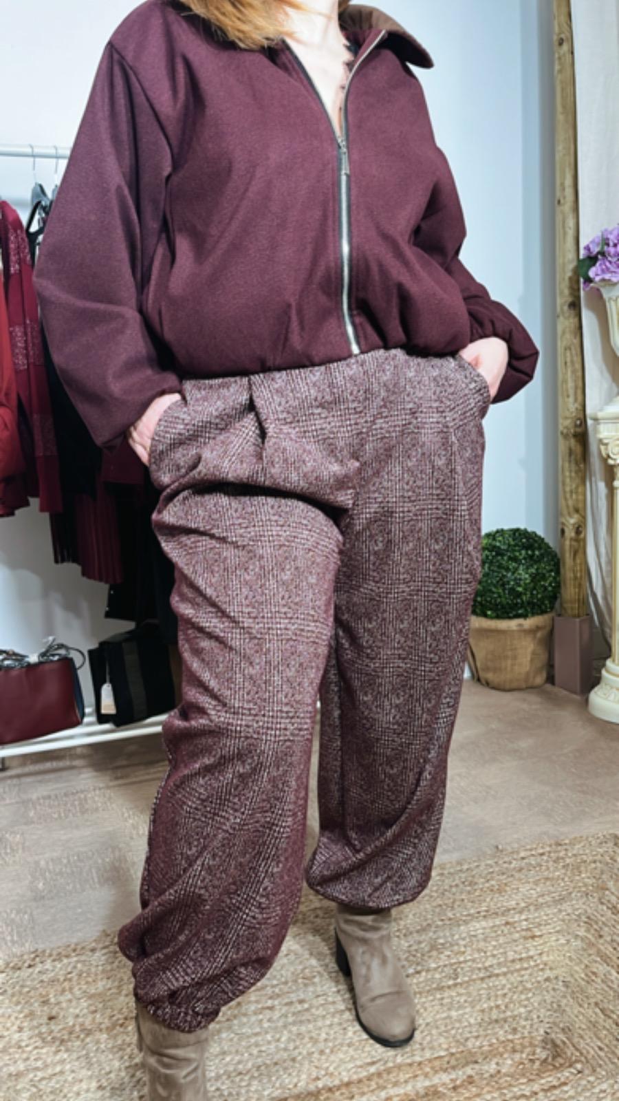 Pantalón de color granate con pequeñas líneas de color blanco , cintura de goma tiene dos pequeñas pinzas en la parte de delante también tiene bolsillos ,además la terminación de la pierna es con goma, talla única tallaje desde la 40 42,44,46